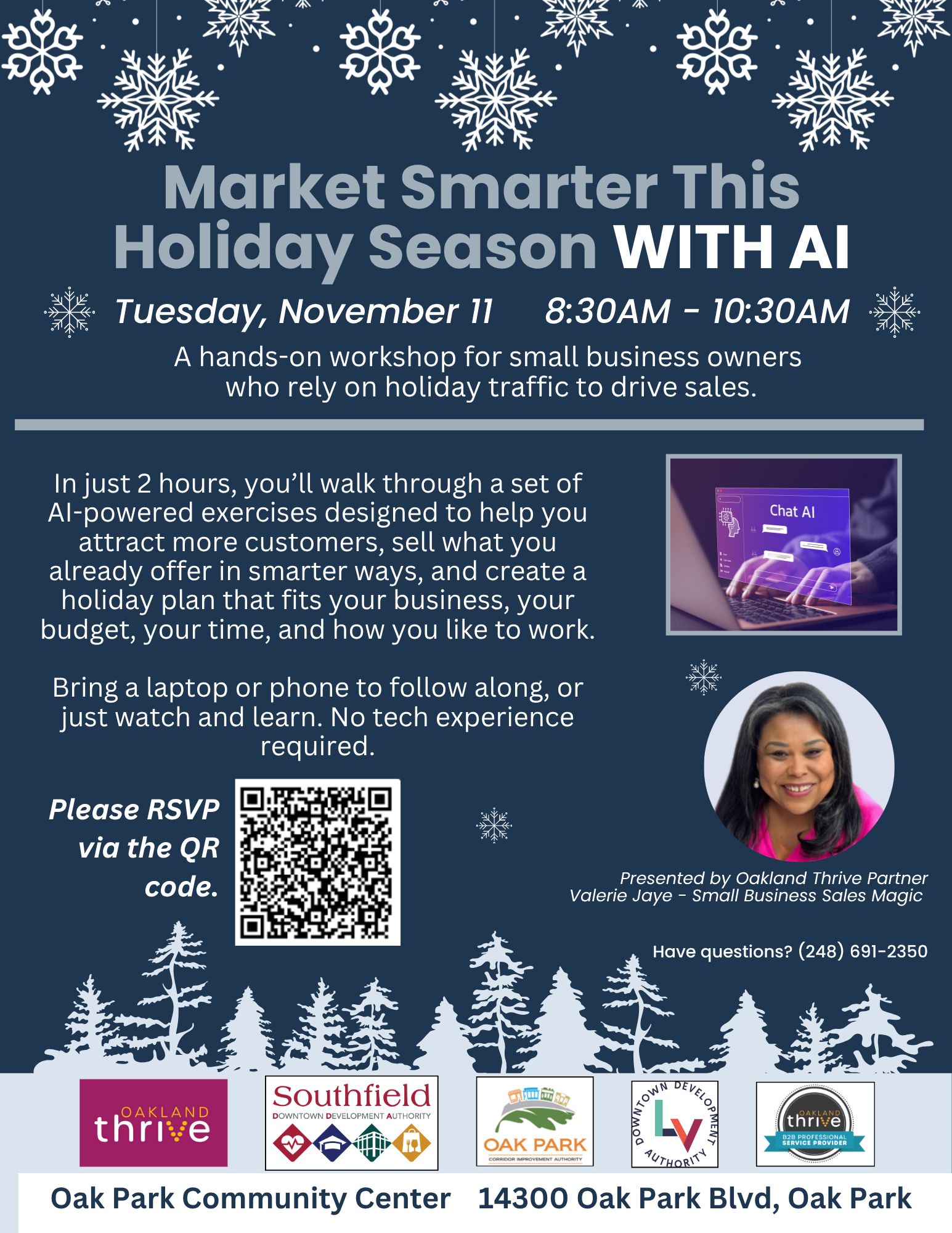 A hands-on workshop for small business owners who rely on holiday traffic to drive sales. This 2-hour session is designed for small business owners who depend on holiday traffic to bring in revenue—whether you run a storefront, sell from home, or offer products or services. We’ll walk through a series of simple, practical AI exercises to help you: