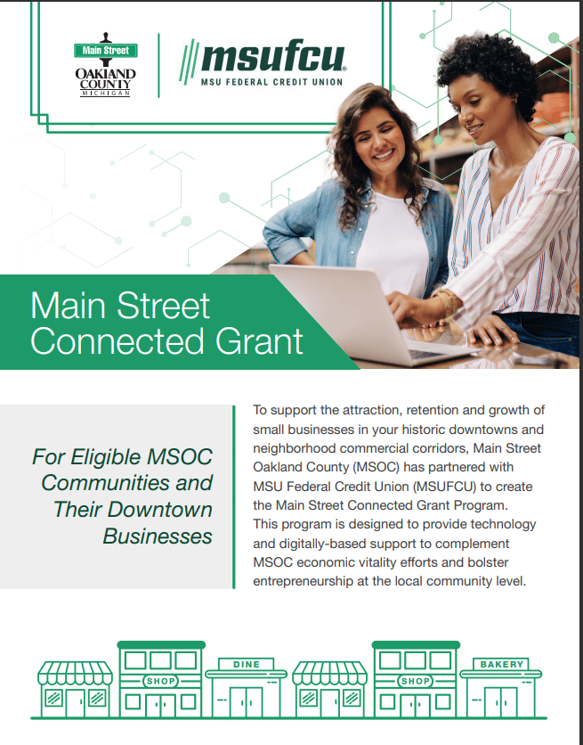 To support the attraction, retention and growth of small businesses in your historic downtowns and neighborhood commercial corridors, Main Street Oakland County (MSOC) has partnered with MSU Federal Credit Union (MSUFCU) to create the Main Street Connected Grant Program. This program is designed to provide technology and digitally-based support to complement MSOC economic vitality efforts and bolster entrepreneurship at the local community level