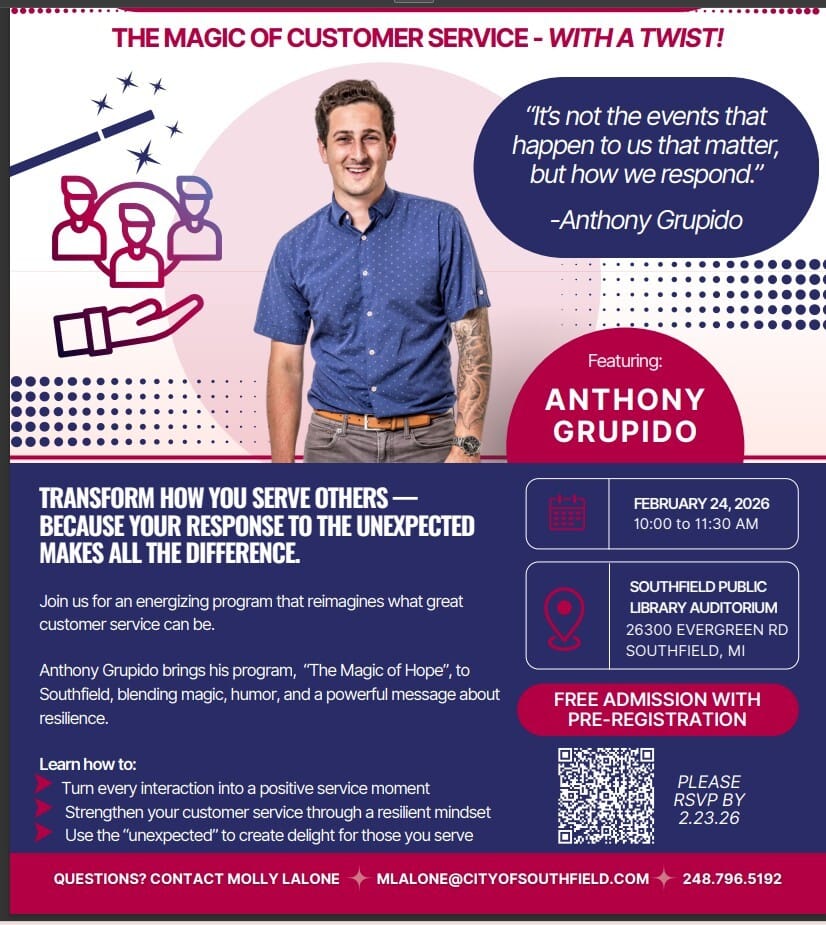 Join us for an energizing program that reimagines what great customer service can be. Anthony Grupido brings his program, “The Magic of Hope”, to Southfield MI, blending magic, humor, and a powerful message about resilience.