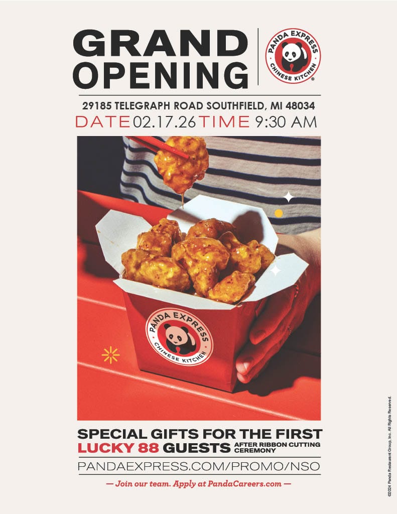 We are excited to invite you to the Grand Opening Celebration of our newest Panda Express, located at 29185 Telegraph Road, Southfield, MI 48034, on February 17th at 9:30 a.m.